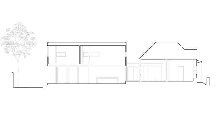 An unexpected double-height space announces the new, public spaces of the house. Openings playfully pin-wheel around this space, allowing light at all times of the day. From the rear, the new volume appears to hover over the garden. The living spaces open up to a north facing deck while the bedroom is nestled in the trees.